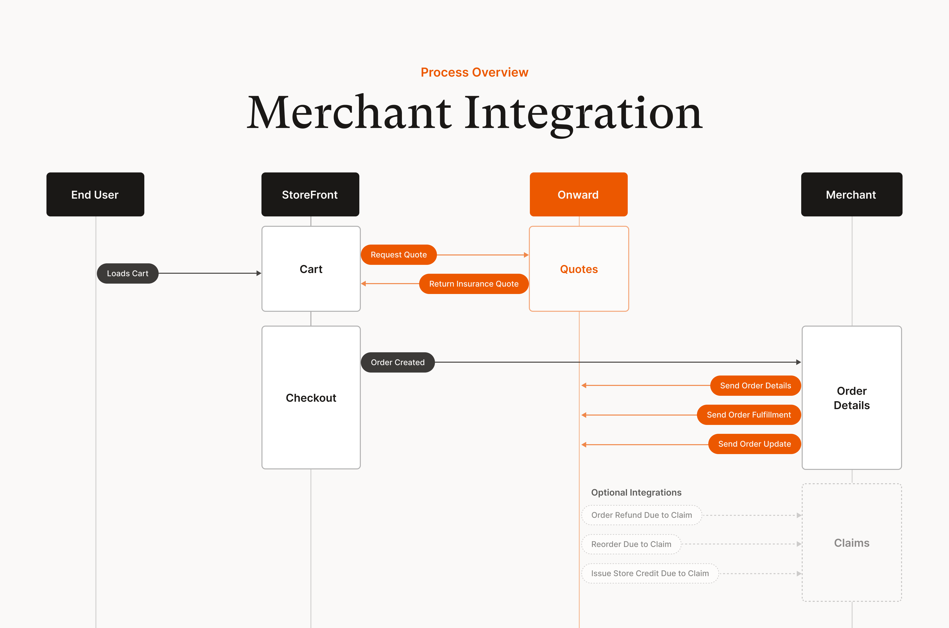 Getting Started 🚀CopyCopy for LLMCopy page as Markdown for LLMsView as MarkdownOpen this page as MarkdownOpen in ChatGPTGet insights from ChatGPTOpen in ClaudeGet insights from ClaudeWe’re on a mission to help brands exceed customer expectations and grow profitably. We’re excited to work with you. Let’s do this!The Onward API enables you to integrate Shipping Protection and other customer benefits into your e-commerce storefront.AuthenticationLearn how to retrieve and use your API Key.Insuring OrdersAdd benefits to checkout and send Onward the necessary data to insure the order.Order UpdatesKeep Onward informed of important changes to orders.Resolving ClaimsEnable Onward to issue reoders, refunds, etc.